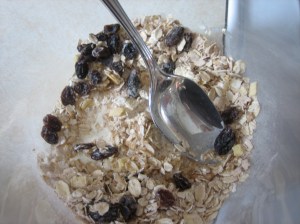 Ideally, one would use plain oats, and flavor them with a bit of cinnamon, brown sugar, and a pinch of salt, all moistened with milk. Being out of oats on New Year’s Day, I resorted to a packet of instant oatmeal, apple and spice flavor. I added a bit more cinnamon to the packet, moistened it with a bit of cream, and tossed in a few raisins.