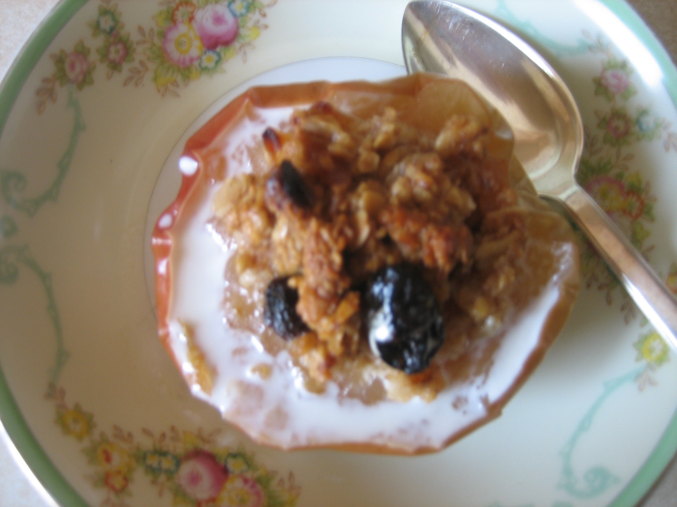 New Year’s Day turned out to be that day. I devised my own recipe that morning, with what I found in my pantry, but having taken a look at the suggestions in The Joy of Cooking, it’s clear that one can go many ways with a baked apple – from basic with just brown sugar and cinnamon to a richer version involving almonds, figs, breadcrumbs and ginger to a savory sausage number. But below you’ll find my version of the apple we ate in Lancaster, and proving that old saw, “Mother knows best,” Greta was delighted with the result.