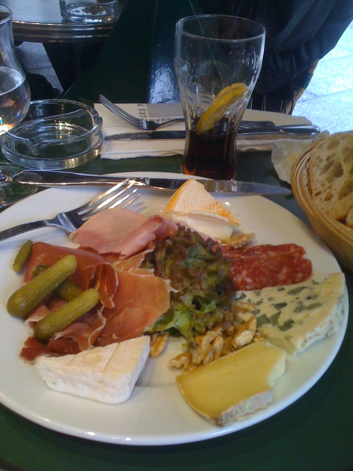We are seated aboard our plane for the flight home. What a terrific time we had! Above you see part of our last Paris lunch, eaten at Les Philosophes in the Marais. Electronic devices must be turned off now, so more sharing must wait. . .