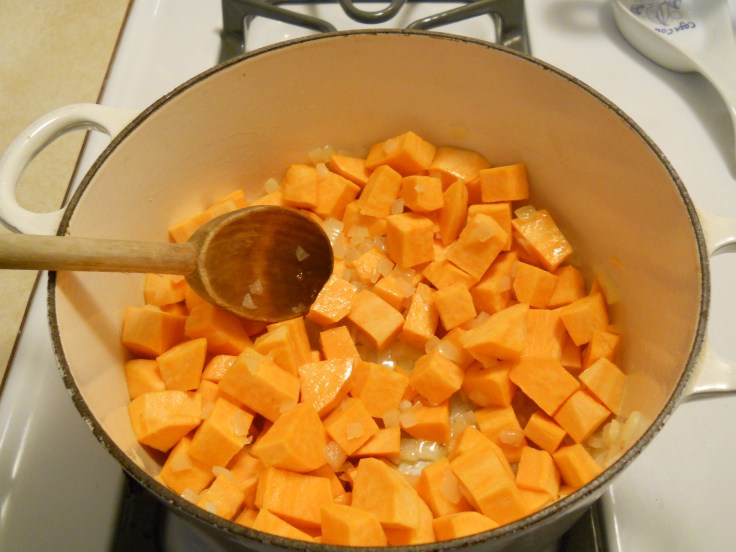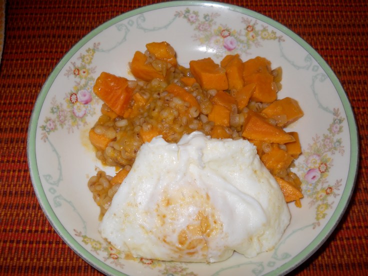 Toast the barley in a skillet over low heat until just lightly brown. Set aside. Saute the onion in oil until softened. Add the sweet potato and barley and stir to coat with oil and onion. Add the vegetable broth, salt and pepper, bring to a boil, reduce to a simmer and cover. Cook until the sweet potato is just tender (you don’t want it too mushy), somewhere in the 20 – 35 minute vicinity, depending on the size of your sweet potato cubes, and the strength of your flame. Prepare the eggs (“over easy” is usually the way I go, but poached would be lovely, too). Enjoy!