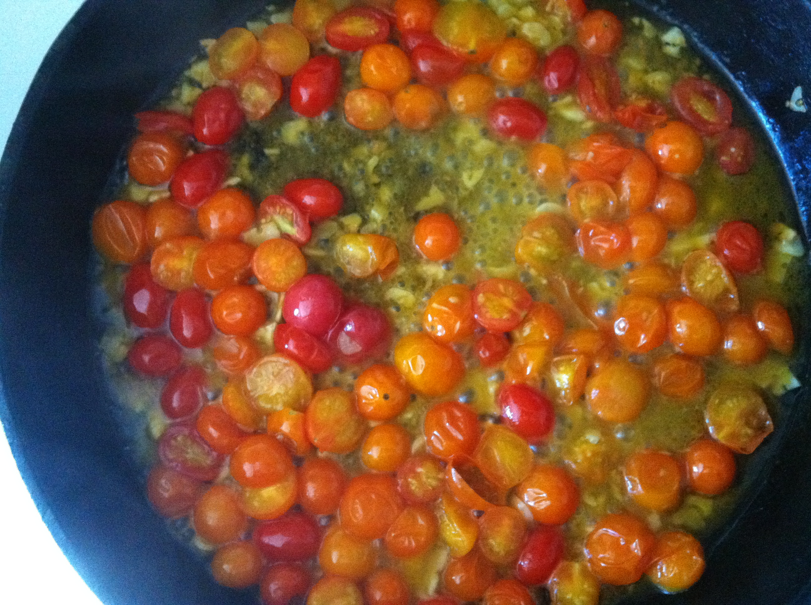 Into my favorite 50¢-at-a-yard-sale cast iron skillet went some olive oil and chopped garlic, followed a few minutes later by the halved tomatoes.