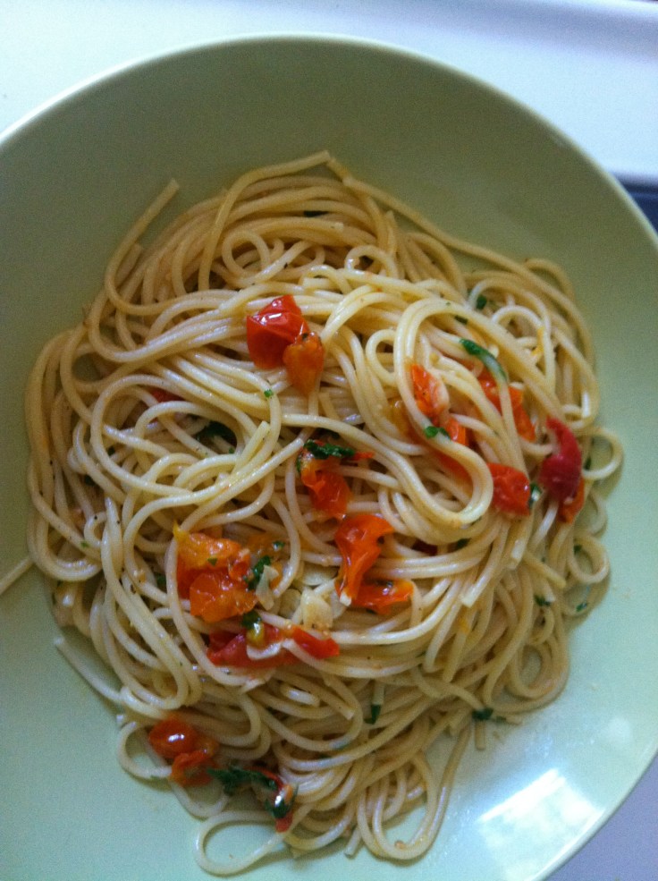 She couldn’t have made a better choice. It was the Monday following Hurricane Irene and I had been rendered carless thanks to the flooding that occurred in the parking lot of our building. We were planning a walk to the grocery store later on, but for lunch I needed to work with what I had. And what I had, thanks to a day before gift from my sometimes-farming boyfriend, was a beautiful little assortment of fresh red and yellow grape tomatoes.