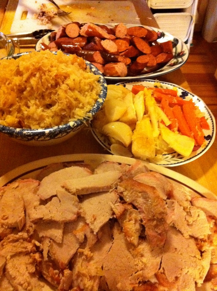 Ok, so mixed results from last year’s lentils. Could be because I didn’t eat the lentils on New Year’s Day itself. This year, however, I was determined to do all I could to ensure a luck-filled year. And since the tarot card reader Celtic Cricket had informed me that I was in for some tough going in the early months, it was important that I make a strong culinary choice on New Year’s Day. What to do? 12 grapes at midnight, one for each month of the year, like the Spaniards? Or should I go with the Danes and serve myself up a nice dish of stewed kale sprinkled with sugar and cinnamon? Perhaps a little mashed sweet potato with chestnut, some simmered burdock root, a spoonful of sweet black beans, and some fish cakes – a few of the components of the Japanese osechi-ryori would be the way to go. But the decision was made when I received an invitation from a close friend to attend his family’s annual pork and sauerkraut party. Though of Italian descent himself, his wife hails from western Pennsylvania, where New Year’s Day pork and sauerkraut eating is a given.